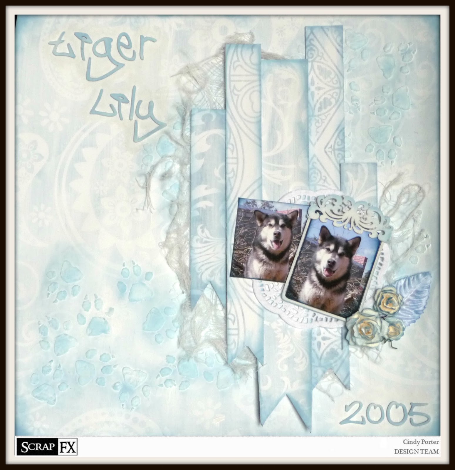 For this layout I used several different prints of the Bella papers and white washed them as the colour was too strong for my photo's. I used the Scrap FX Paw Prints stencil to create a themed textured background. I again used the Scrap FX Graffiti Alphabet for the title, and I used the Scrap FX Graffiti Numbers for the subtitle.